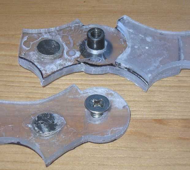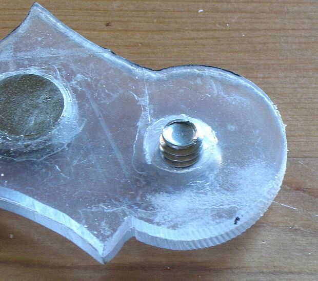 Ahora hacer el árbol del batarang. Las dos alas en la posición final de la cinta y perfore un orificio piloto aunque el centro. Separar las alas otra vez y perfore un agujero en el ala pivotante sólo lo suficientemente grande como para aceptar bastante bien el tornillo de máquina (15/64" era correcto para mí). A través de la Asamblea de ala fija taladro un agujero lo suficientemente grande como para aceptar el conector común de muebles (3/8" era perfecta). El conector debe girar sin problemas pero no se suelta.