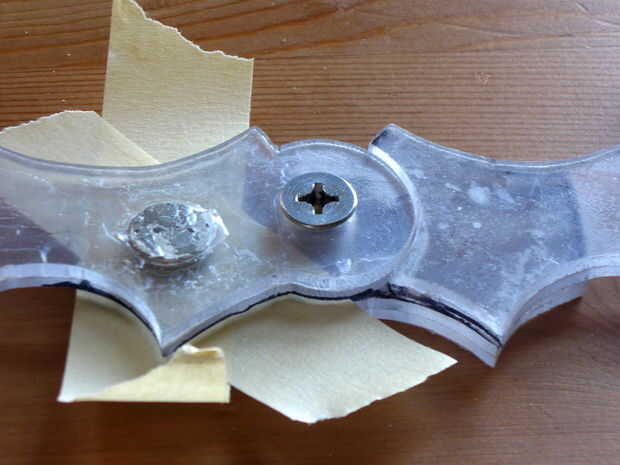 Ahora para colocar los imanes que sostenga el batarang en su lugar cuando se abre. El batarang en posición final de la cinta y perfore un asimiento piloto a través de la parte donde se superponen el pedazo de forro y el ala pivotante. Colocación exacta de este agujero no es importante, sólo asegúrese de que no está muy próxima a cualquiera de los bordes. Luego ampliar este agujero con el ½" woodborer poco. Yo ½" porque mis imanes eran sólo un poquito más pequeños que el, pero si usas imanes diferentes de mí, adaptar el agujero para encajar. Usando cinta para separar los agujeros en las alas (por lo que no pega las alas), pegar los imanes en el lugar. Usé dos por ala. Asegúrese de alinear el norte y el sur correctamente para que el ala no repeler a sí mismo! Los imanes no toman mucho estrés, por lo que he usado resina de epoxy de dos parte para este trabajo, que también llenó el espacio alrededor de los imanes.