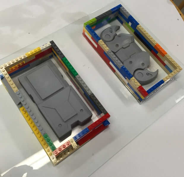 Todas las piezas eran cebadas y lija en húmedo para obtener una superficie lisa. Mayoría de las piezas fueron capaces de ser moldeados con un molde de una cara "descarga". Adherir la pieza de la hoja de vidrio, construyó un muro de molde alrededor de cada uno con los ladrillos de Lego.