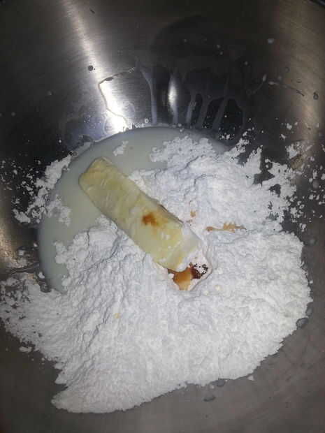 Usar una mezcladora para mezclar todos los ingredientes del glaseado hasta que quede suave. Tal vez mezclar media cucharadita de Glas de colorante amarillo.