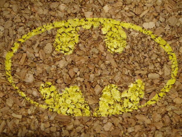 Una capa de corcho está respaldada por un Servilletero reciclado, y la señal del murciélago es esponja pintado y sellado.