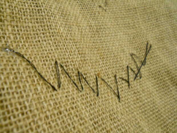 Mientras que las latas se secan, con un hilo negro y aguja, crear la boca de la máscara. Siembre la máscara en forma de zigzag de izquierda a derecha, cada zig-zag siendo.75 pulgadas de largo. Tratar de hacer la boca en el lugar normal donde sería en su cara cuando usted donde él.