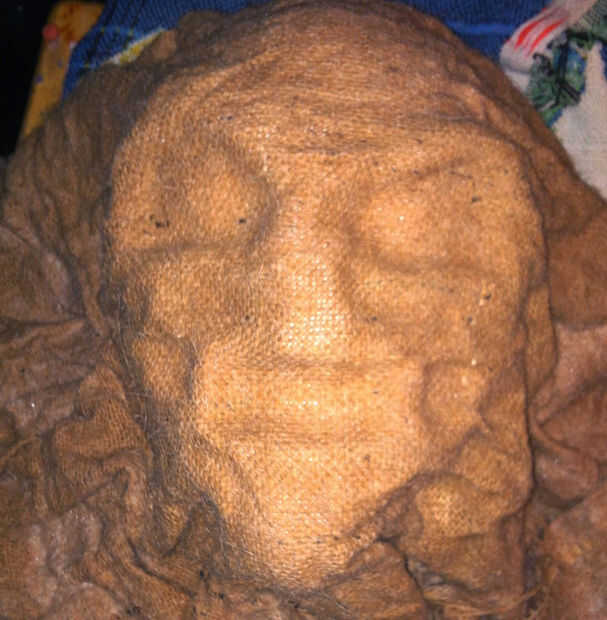 Una vez que lo tienes mojado, pero no hasta el punto que eres capaz de sacar la mano, coloque la tela sobre su busto esculpido (debe ser acostado) y deje que cuelgue la parte trasera del busto. Asegúrese de prestar atención alrededor de los zócalos del ojo y la boca, presionando firmemente en su lugar.