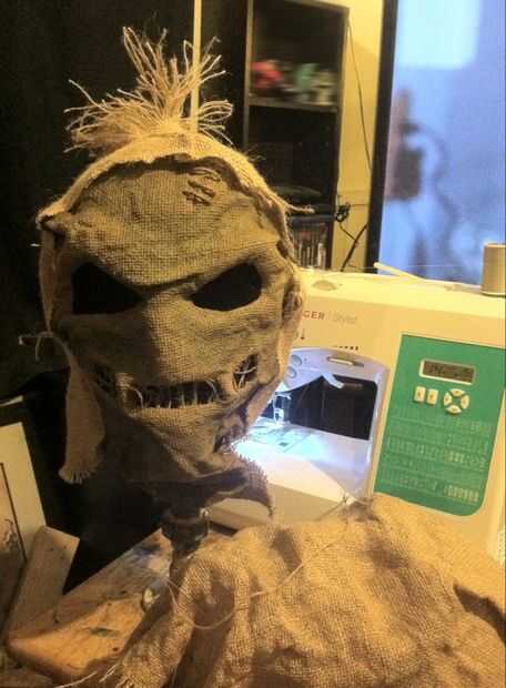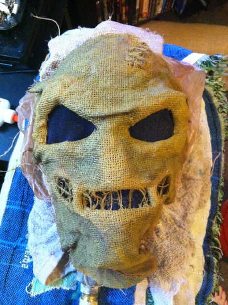 Si usted está siguiendo a lo largo hasta el momento, esto es sólo la mitad de la máscara, pero la parte de atrás de la máscara, repitió el proceso entonces cosida a la parte de atrás hacia delante después de que terminé decoración. La parte de atrás que le recomendamos sin embargo una vez es lo bastante seco como para cortar un estrecho corte 3/4" de la manera para arriba y agregar botones de madera. A hacer subir la máscara y bajar mucho más fácil.