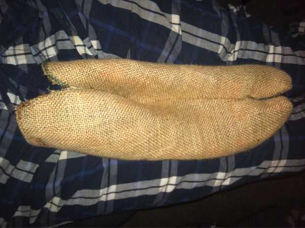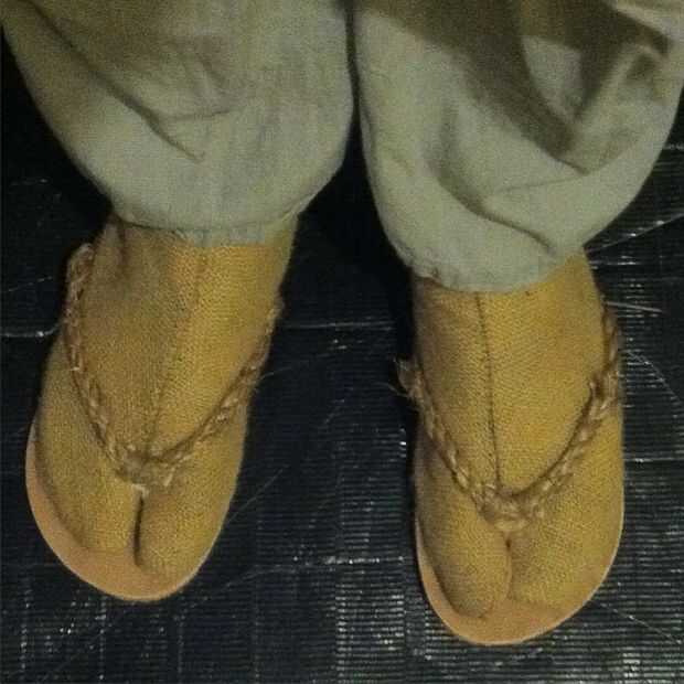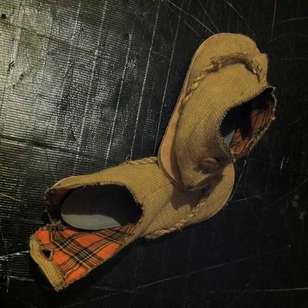 He añadido una entretela a la arpillera de calcetines para evitar picar mis pies durante el desgaste. Las sandalias fueron modificadas con la cuerda para una mirada más auténtica. Insertos de Dr. Scholl fueron también aumentar para la comodidad.