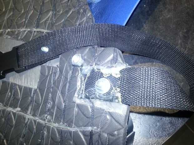 Idealmente usted quiere luego fije la cincha de cinta a estos pernos antes caliente pegado en la parte inferior y luego roscar la tuerca en. sello con locite demasiado. También os recomiendo usar arandelas para sujetar en su lugar (véase arriba).