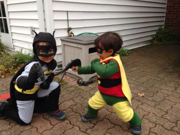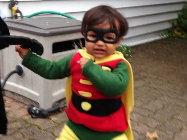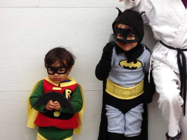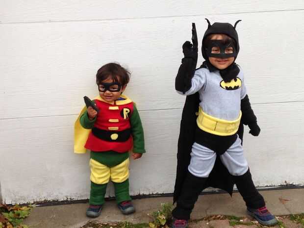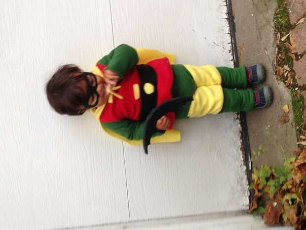 Traje de Robin es también de paño grueso y suave y basada en el traje de Dick Grayson de Burt Ward con algunos cambios por condiciones climáticas. El traje fue construido de manera similar de Batman. Que consiste en pantalones, troncos, cubiertas de arranque, correa y camisa. La máscara es otra vez espuma de artesanía que fue calor a la cara de mi chico entonces usado utilizando una cinta elástica. Había tienda ecológica compró guantes pero el pequeñín se negó a llevarlos.