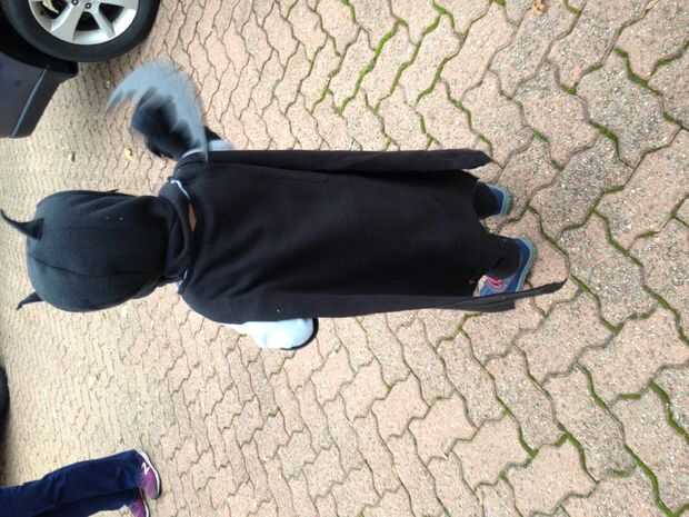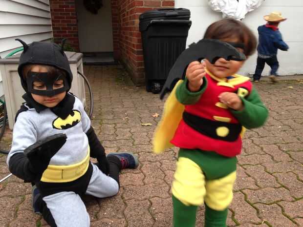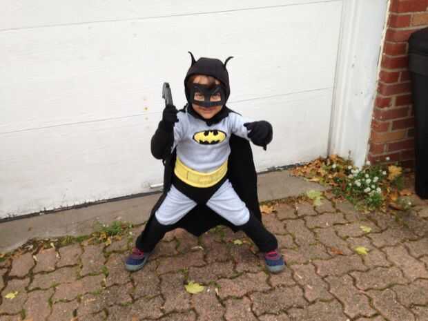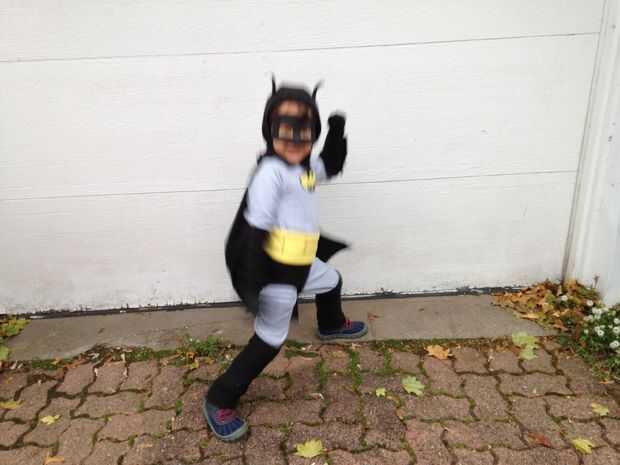 El traje de Batman está hecho de lana porque Pennsylvania Halloween tienden a ser frío. El traje consta de pantalones grises, polainas/bota cubre, troncos negros, camisa gris, guantes negros con capucha de cinturón negro de aletas amarillas y un capote negro que fue cosido a la camiseta. La máscara fue hecha de espuma de artesanía que fue calentada y moldeada a la cara de mi hijo y atada con una correa elástica. Los guantes eran tienda compró guantes elásticos. Las líneas y el símbolo de la correa están bordadas. El logo del murciélago ha invertido colores porque era tarde y estaba hablando de símbolo de Robin pero mi esposa me misheard.