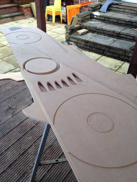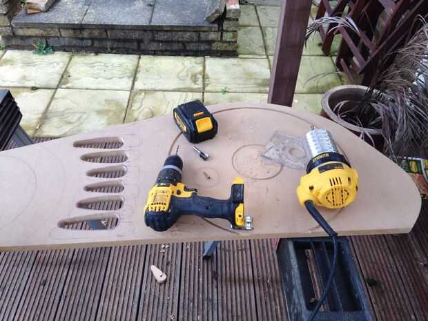 Una vez que un lado cortar y limpiar esta sujeta a la izquierda sobre hoja de MDF y utilizando el router con plantilla poco trazado alrededor para cortar el otro lado. Tuve que limpiar un par de bits donde la broca de la plantilla era demasiado grande.