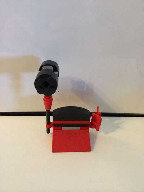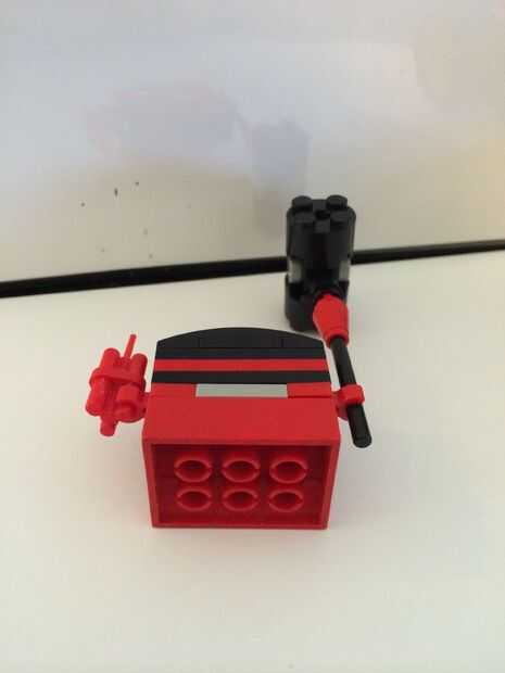 Tome el pedazo de palo negro y fije el trozo de cono rojo de 1 x 1 sobre. Añadir el trozo de eje de 1 x 1 de la Cruz Roja. Añadir pieza cono negro de 1 x 1. Añadir 1 x 1 5stud pieza cono negro. 3 círculos de 1 x 1 gris y añadir en la pieza de 5 estudios. 2 piezas de cilindro negro y añadir en la pieza de 5 estudios.