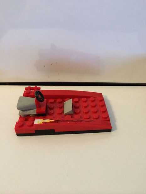 Tomar una placa negra de 6 x 10. poner una placa de 4 x 4 rojo en la mitad inferior. poner una placa de 4 x 6 rojo en el medio superior. poner un motor gris en el medio superior. Tomar un 2x1plate negro. poner un volante rojo en la placa. poner detrás de motor. Guarde la pieza gris inclinado 2 postes. Haz 4 planchas de 2 x 1 ponen 2 en cada lado. poner rojos largo piezas inclinadas en ellos.