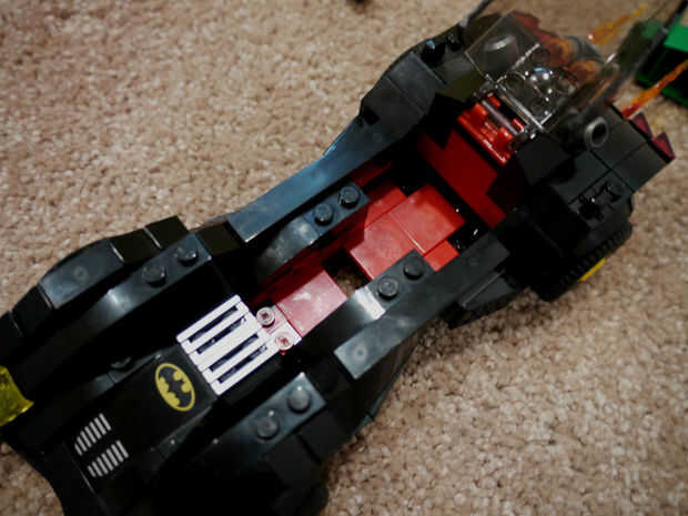 Después de destripar el Batimóvil todavía necesitamos un lugar para poner el cargador. Por lo tanto, quitar el ladrillo plano en el centro que se abre un agujero para el cable USB a través del hilo de rosca. Después de que algunos de los azulejos en la parte inferior así hay una superficie para poner el JB Weld en.