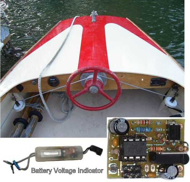 Controlado por un AVR ATTiny, este indicador de voltaje programable mide y reporta la tensión con una serie de destellos de un LED situado en el tablero de instrumentos cuando el interruptor de la bomba de sentina está en la posición automática. La luz puede controlarse a través de nuestras ventanas de la casa en la noche de más de 100 pies. Este indicador de voltaje de batería es muy versátil y puede utilizarse en gran variedad de aplicaciones que requieren la supervisión de un nivel de voltaje de la batería. Por ejemplo, barcos, vehículos todo terreno, motos de nieve, vehículos y proyectos solares que tienen las baterías. Además, este sistema ofrece una constante de 12 voltios a 1 amperio a pesar de la tensión de entrada variable (DC 3-35V) auxiliares que es ideal para pequeños motores, solares y otras fuentes de energía fluctuante. Esto significa que la medida de voltaje es exacta por debajo de 3 voltios por un regulador de 5V adicional que es la fuente de voltaje y corriente de referencia del procesador.