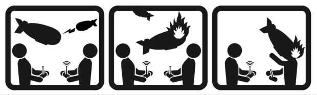 Batalla dirigibles no rígidos son dirigibles Bluetooth/RFDuino-controlado diseñados para luchando verdaderamente loco. Hemos desarrollado para llenar de hidrógeno para explosivas batallas al Burning Man, pero este diseño también funciona con helio para el duelo en el interior.