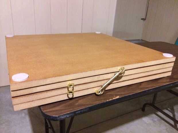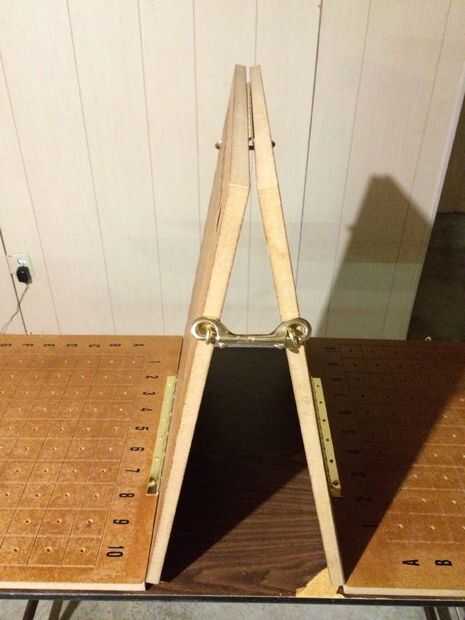 Instalación opcional ganchos y ojos o similar en el lado de los paneles para trabar el juego en una posición contraída para el almacenamiento. También instalé ganchos extras para permitir el juego de bloqueo en su lugar cuando se establece para el juego. (Nota: Si usas cualquier tipo de madera, asegúrese de perforar agujeros para minimizar las rajaduras de la madera contrachapada).