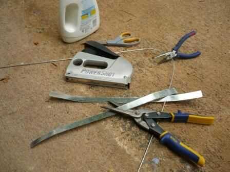 Para los murciélagos que cuelgan tiras de metal trabajaban mejor para mí. Sin embargo, puede usar alambre o cortar una botella de plástico resistente en tiras. La longitud debe ser aproximadamente 8 pulgadas y el ancho debe ser un poco más de la grapa.