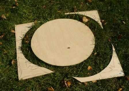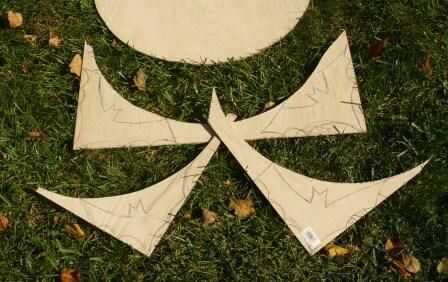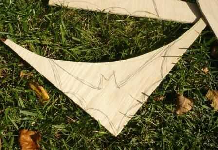 Utilizando las piezas de 4 esquina de cortar el círculo, dibuje 4 murciélagos. Usando una sierra de calar, cortar los palos.
