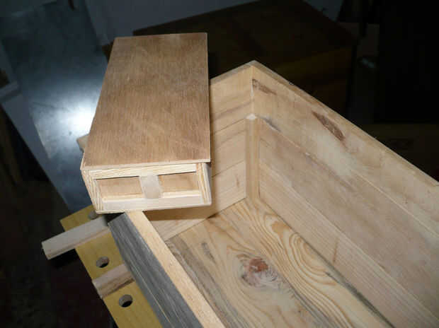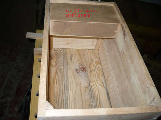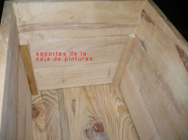 La caja para pinturas se encola en el baul. Como las esquinas tienen los esquineros, y se supone es para lapiceros y pinturas, con el apoyo y la cola, imagino sera suficiente. Finalmente, como veremos despues, la tapa de la caja, tenido eliminarla. Si la forro con tela, no cierra, asi que.... fuera.
