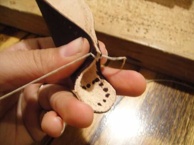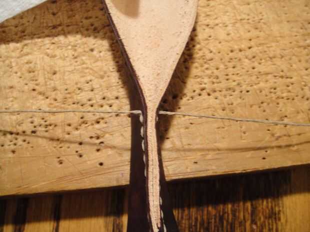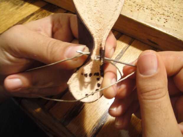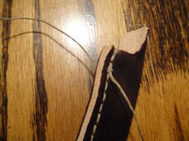 Poner ambas agujas en cualquier extremo de su hilo y uno de usted agujas a través de su primer agujero de la costura y tire a través hasta que tenga aproximadamente la mitad de su hilo a cada lado. Me gustaría ir alrededor de los bordes expuestos como el que tenemos aquí, en este caso con ambas mitades del hilo de rosca. La idea es lo mismo que con nuestro último paso; evitar que el cuero enrollado en sí mismo y el esfuerzo de nuestro hilo.