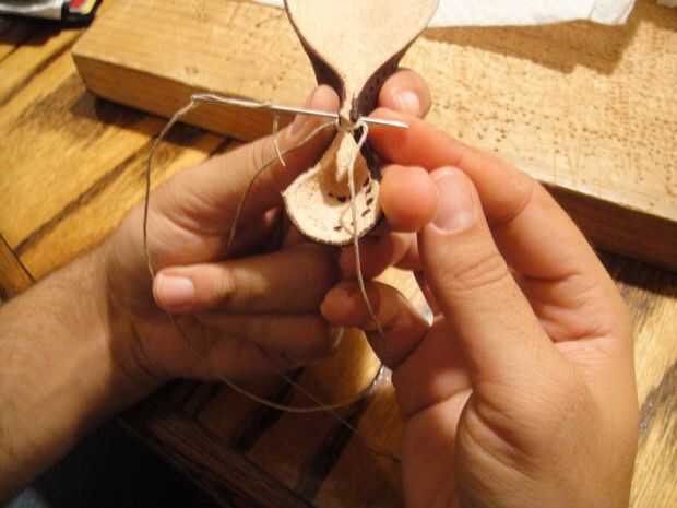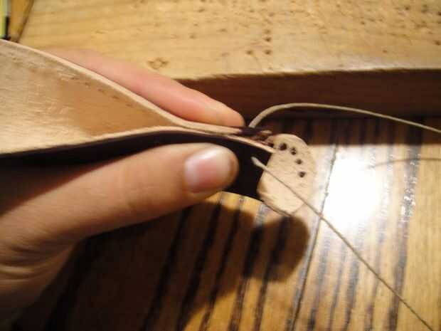 Una vez que ha llegado al último agujero, adelante alrededor así que el borde de la puntada y trabajar su camino hacia arriba proyecto para dos o tres agujeros antes de atar apagado. La razón que usted querrá hacer esto es en caso de que el nudo no mantiene no desentrañar. Pasar una aguja para que todo esté en el mismo lado y tire de ella el hilo. Lazo de sus hilos de rosca juntos (nudo doble para la suerte) y empuje la aguja restante a través del orificio para el otro lado, tirando de su nudo en el cuero.