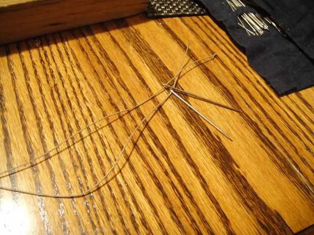 Empuje ambas agujas de la parte inferior a través de los agujeros de la oposición y tire hasta que los lados se reúnen al ras y el hilo es aproximadamente igual en ambos lados.