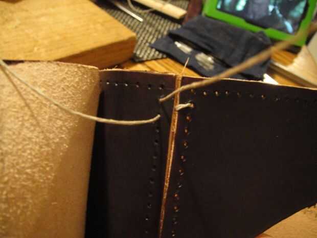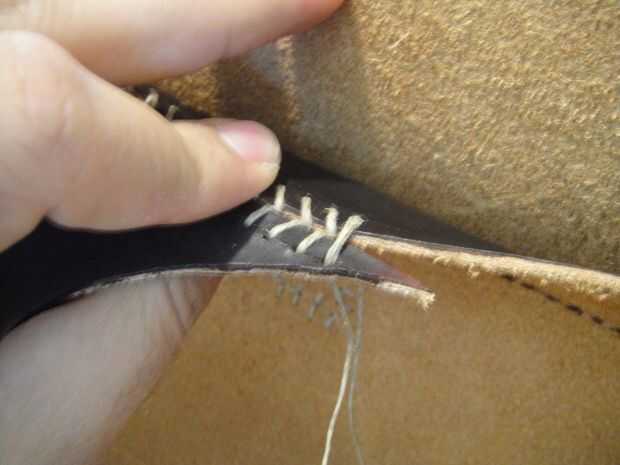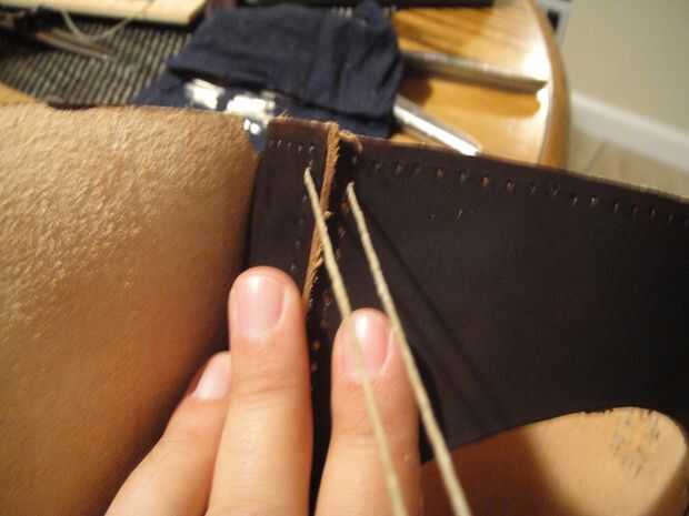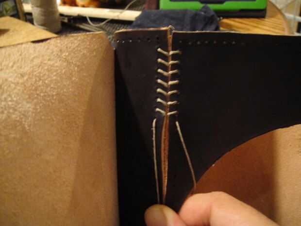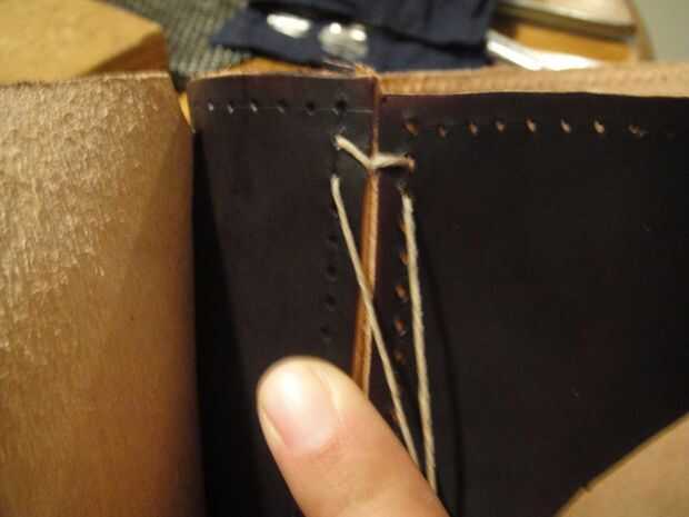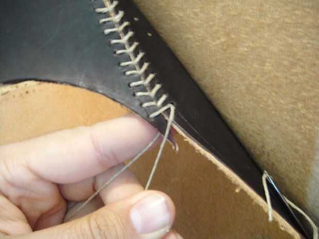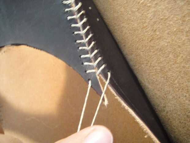 Al llegar a los últimos agujeros, cruzar las agujas uno con el otro como se muestra y pasar a la parte posterior del cuero para amarrar los extremos del hilo de rosca firmemente.
