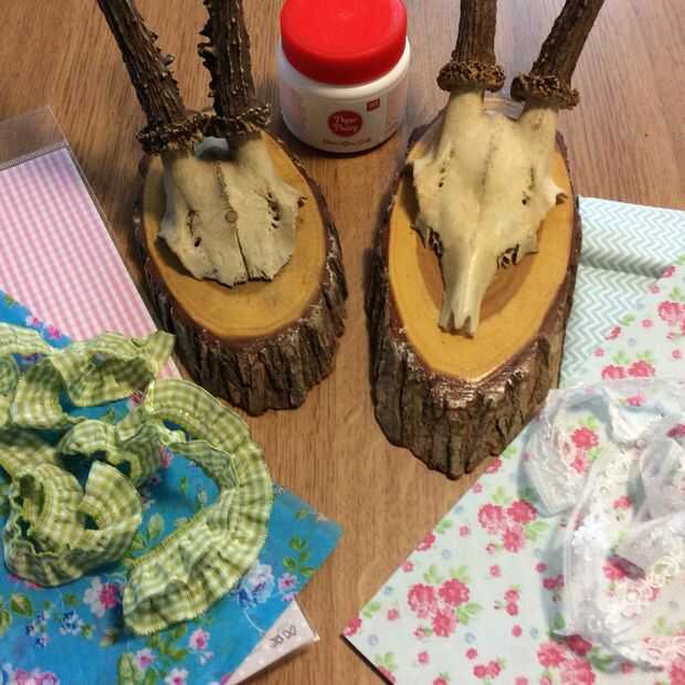 Encontramos estos roe buck astas montadas en un trozo de madera acabado en el mercado de pulgas por unos 10 € cada uno. Escuché acerca de este material de papel maché y encontrar en la tienda de artesanía. También tenemos algo de tela; una pieza es un cuarto de la grasa y el otro es tela con adhesivo. Cinta de lujo es una necesidad para el ajuste, alrededor de un metro es más que suficiente.