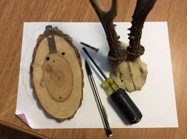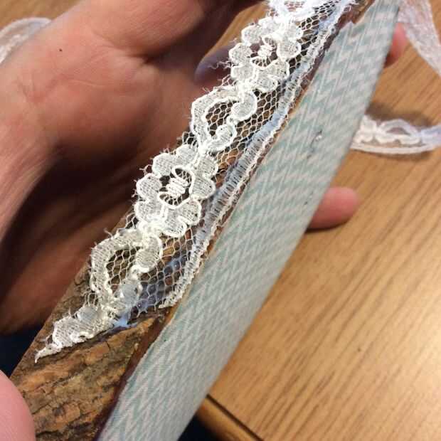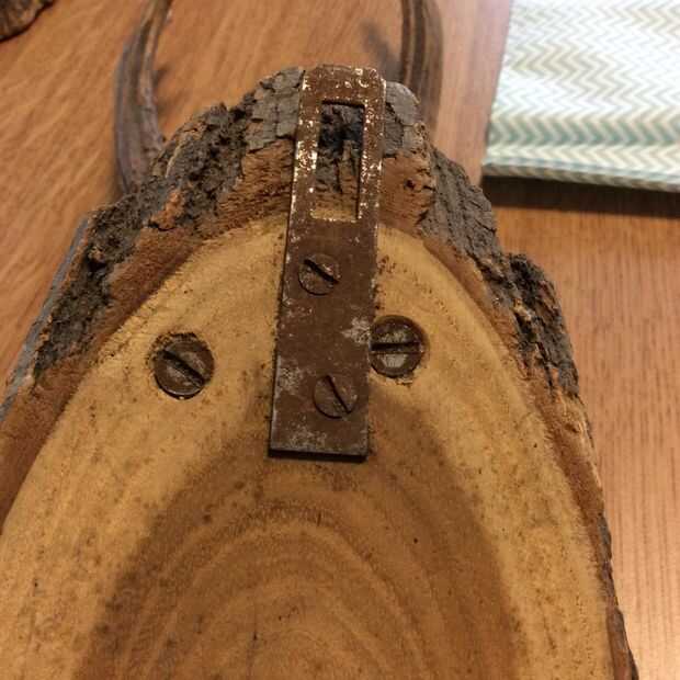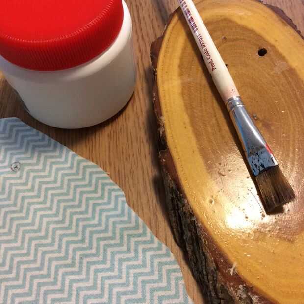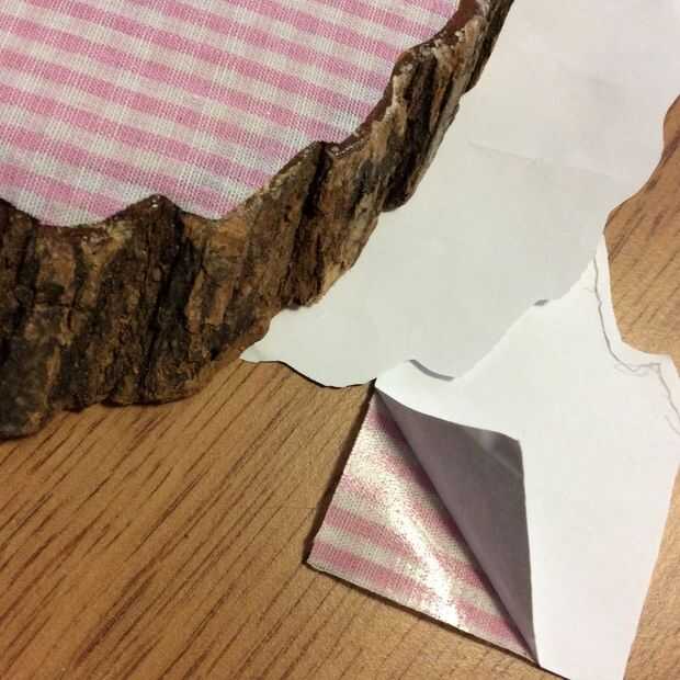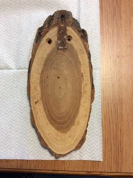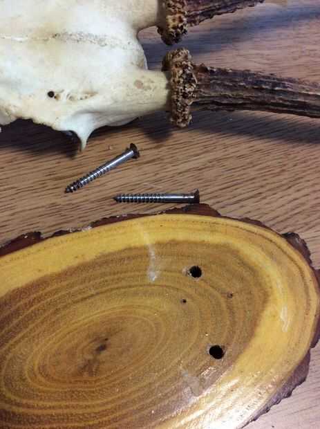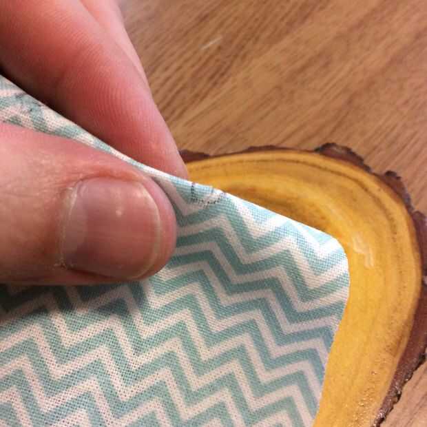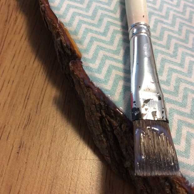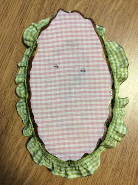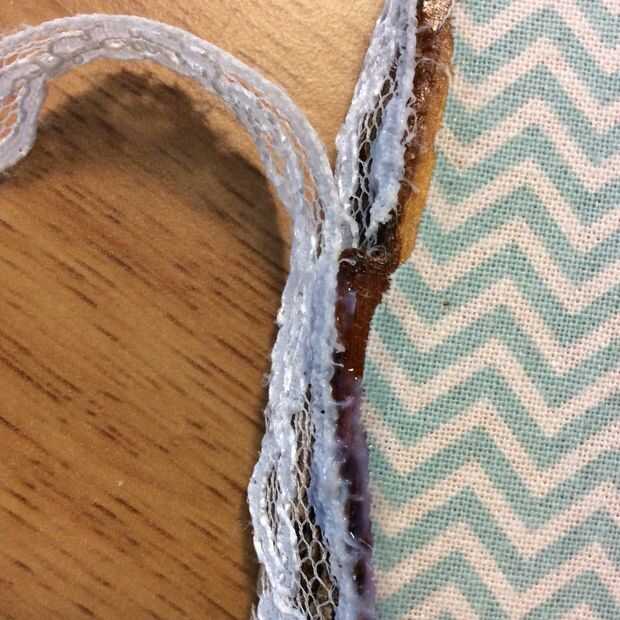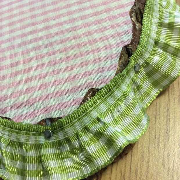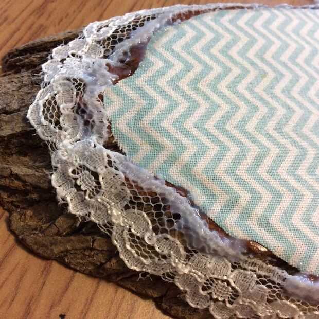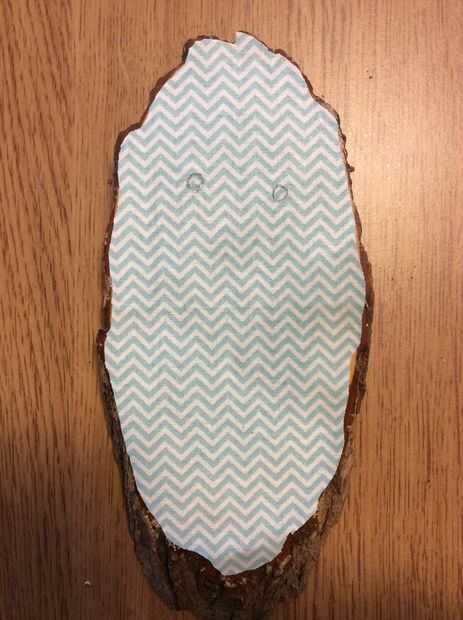 Remove the screws that hold the wood and skull together. Trazar la cara de la madera en la parte posterior de la tela para que cuando se aplica a la cara de la madera. Hacer pequeños cortes donde vendrá a través de los tornillos y cortar aproximadamente 1/8 de pulgada dentro de su línea de traza para dejar espacio para la corteza. Usé un pincel plano para recubrir la madera con algunos modge podge. La tela aplica pegamento extra alrededor de los bordes para evitar que se deshilache. Pude usar modge podge para la delicada cinta pero la otra cinta tenía elástico y había utilizo algunos clavos tachuela para mantenerlo en su lugar.