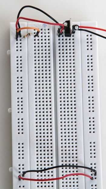 Por último, vamos a añadir un LED para mostrar cuando se acciona la Junta. Conectar una resistencia de k 10 desde el carril de tierra al cátodo del LED (la pierna más corta) y un cable para conectar el ánodo con el carril positivo. He utilizado un azul 3mm LED y la resistencia de 10 k para que no se queme demasiado brillantes.