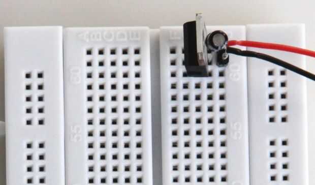A continuación añadir un condensador de desacoplamiento de 10uF a través de los pines de alimentación. Nota que estos condensadores están polarizados, así que necesitarás conectar el lado con el indicador negativo (buscar una raya o señal - ve – o consultar su hoja de datos) a GND y el otro a + ve.