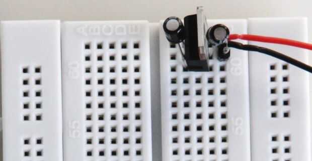 Conecte el otro capacitor de 10uF a la GND y la salida del regulador y luego tomar conduce de la tierra y la salida a los carriles de la energía de tu protoboard. Esta energía es "limpia" y será en 5V.