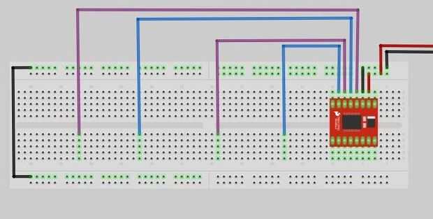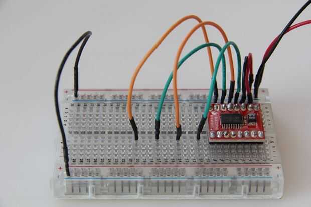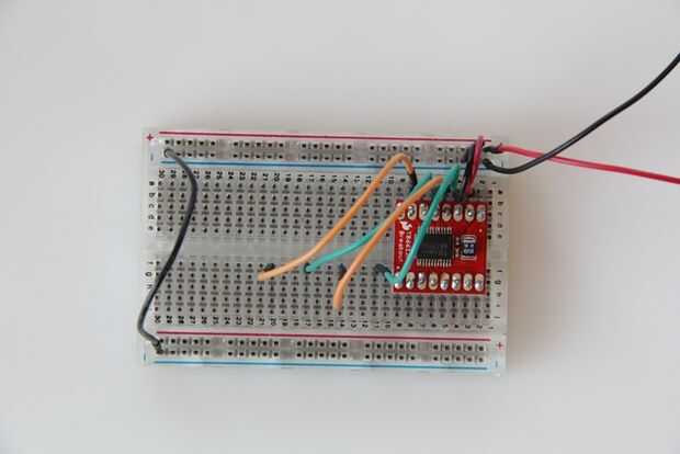 Conecte el A01/A02 & B01/B02 de la impulsión del motor a puntos de la protoboard. Espacio el jumper cables 2 puntos separados para permitir conectar los diodos en el siguiente paso, así como para mantenerla compacta.