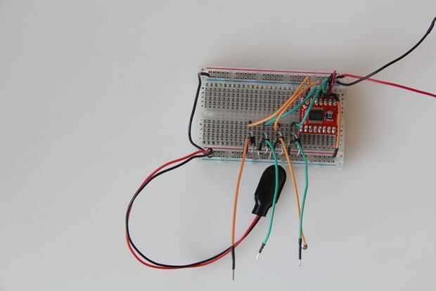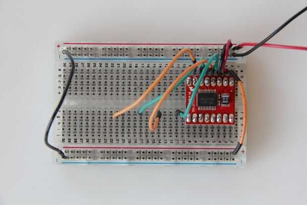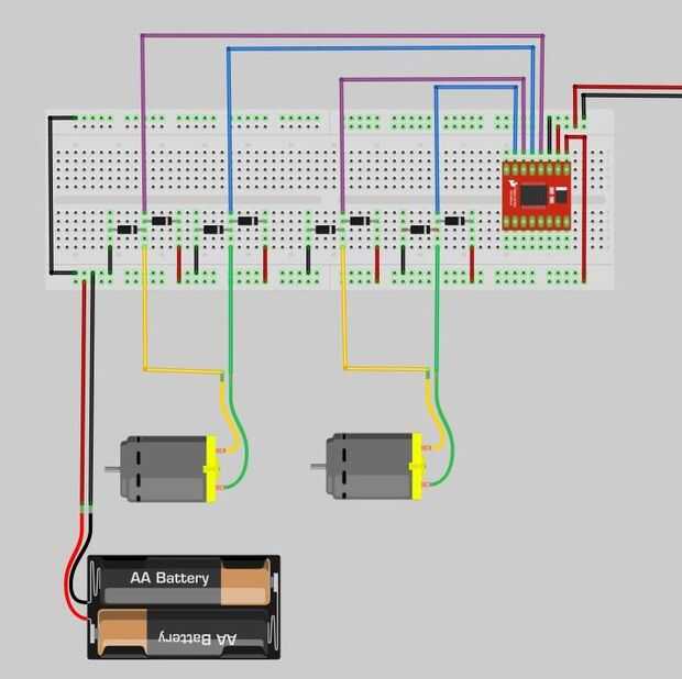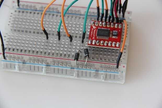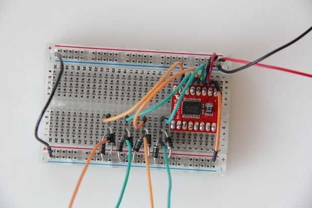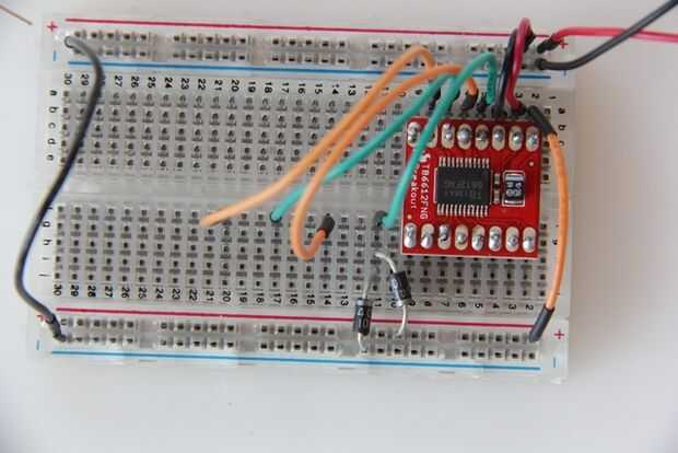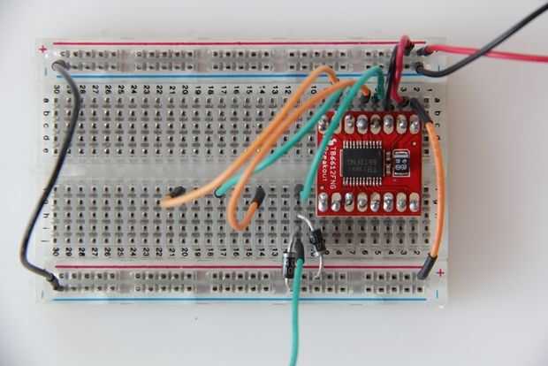 Para proteger el conductor y el circuito contra la parte posteriora EMF, que necesitamos conectar 2 diodos de rectificador a cada conexión que hacen que los motores a la placa. Esta configuración proporciona protección detrás EMF sin importar la dirección del motor puede girar.