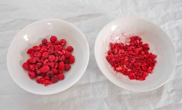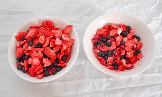 Separan los pequeños pedacitos de fruta y terminó dejando a un lado cerca de 1/2 - 1 taza de valor de la fruta de la parte superior de mis delicias (yo diría incluso guardar el polvo con sabor a fruta, pensé que parecía agradable sobre la trata y proporciona más color). Además, he dejado las frambuesas y arándanos lo eran, pero rompió las fresas un poco por lo que no esté sólo en grandes grupos. Sólo quebró las fresas por la mitad, por lo que no necesitará salir una tabla para cortar y cuchillo o cualquier cosa.