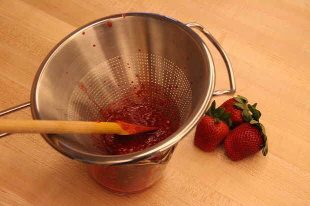 Añadir fruta picada, agua, azúcar, ralladura de naranja y jugo de limón en una cacerola pequeña Cocine a fuego medio hasta que la fruta ha roto bien y todos los ingredientes están totalmente integrados Colar por un colador fino Mida 1/2 taza para el Ganache y conjunto resto aparte para decorar