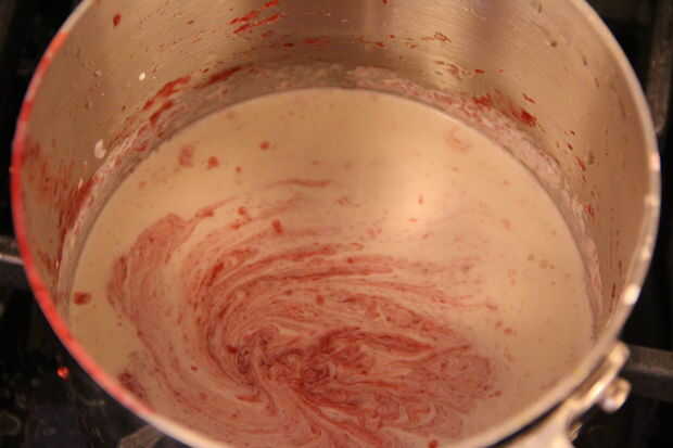 En una cacerola pequeña colocar la crema de leche y 1/2 taza de salsa de bayas y llevar a hervir a fuego medio.