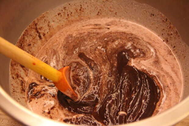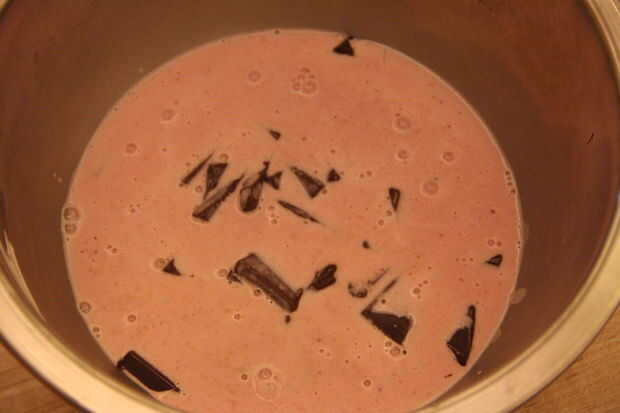 Vierta la mezcla sobre el chocolate y dejar reposar durante 4 minutos o hasta que el chocolate se ablande.