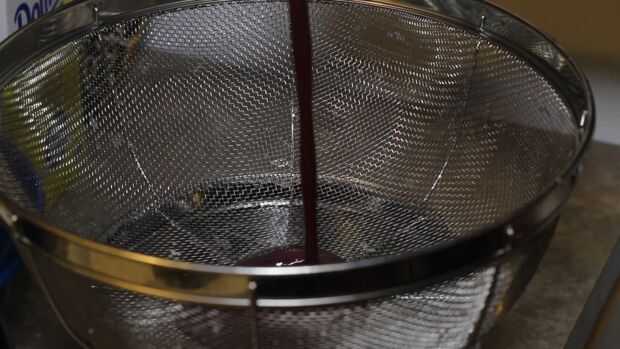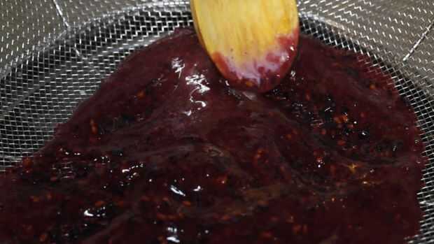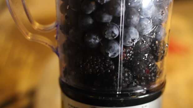 Cortar las fresas y ponerlas en la licuadora con un poco de agua. Pulse en alto hasta que estén un puré fino. Ejecutarlas a través de un colador en un recipiente y use una espátula de goma o una cuchara para presionar el líquido a través de la malla. Deseche las semillas. Repita el proceso, mezclar los arándanos y moras juntos y filtrar en un recipiente separado. Poner éstos a un lado para más tarde.