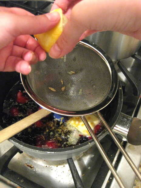 Combinan la mitad de los arándanos, las fresas, azúcar, miel, almidón de maíz, agua, sal y canela en una cacerola y cocine durante 5-6 minutos. Debe espesar para arriba y se convierten como mermelada. Añadir la mantequilla, vainilla y jugo de limón y ralladura. Revuelva para combinar y derrita la mantequilla.
