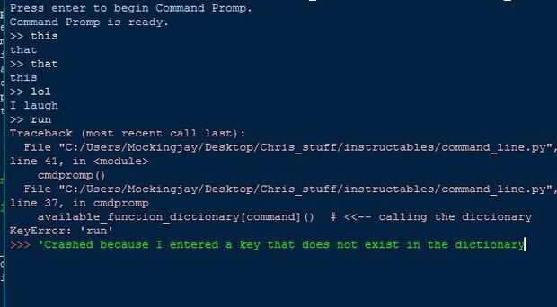Como se ve en la última foto de que este código de arranque básicos se bloqueará si el usuario escribe algo fuera de las claves del diccionario disponibles. Todavía estoy trabajando en mi solución para este problema.