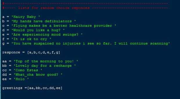 La 2ª foto arriba muestra las 2 listas de respuestas disponibles y saludos. La foto 3 muestra como estoy accediendo estos elementos de la lista al azar para que la programación de Baymax no repetir las mismas cosas una y otra vez, de esta manera él puede mostrar su personalidad. :-)