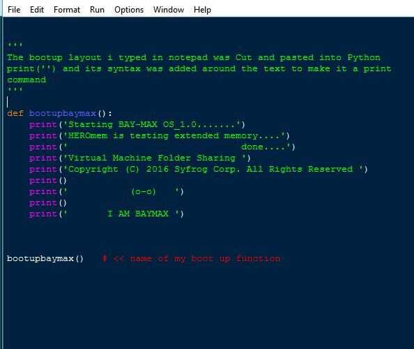 Para el bootupbaymax() función básicamente sólo tenía para cortar y pegar mi bosquejo de archivo de texto y agregar la sintaxis de la función de impresión --> Imprimir ('Qué quiere decir aquí...') <---
