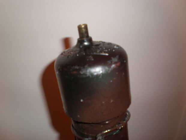 taladro un agujero en la tapa del extremo a fueron se puede poner el extremo pequeño a través de pero no encaja el extremo grande. poner pegamento alrededor donde permanece. luego poner soldadura fría alrededor de la parte de caucho pero no la parte metálica para asegurarse de que no hay escapes de aire.