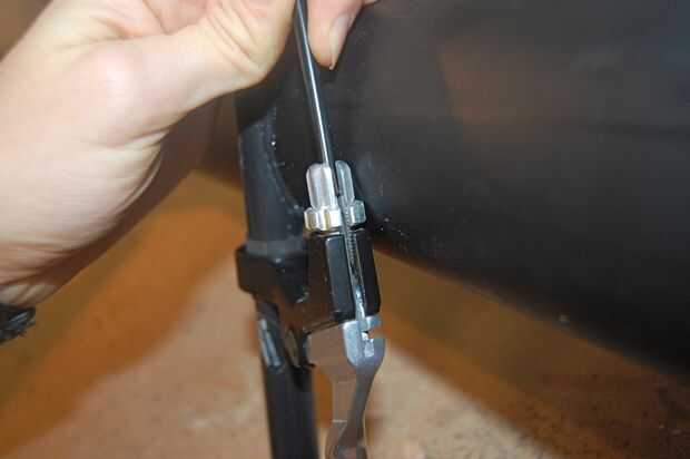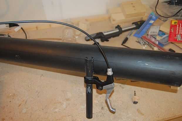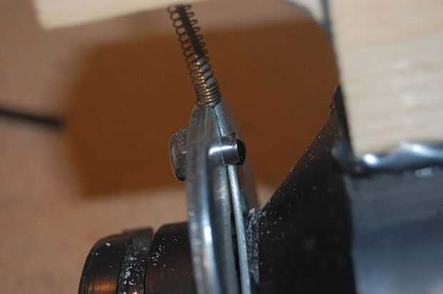 En el comunicado conjunto, pase el cable por el agujero. La abrazadera del cable del gancho agarrador y deslícelo a través de la arandela. Deslice el cable por el orificio de la abrazadera del cable. Puede Agregar un pequeño resorte entre el brazo de lanzamiento y la lavadora si quieres. Con la lavadora en la posición "bloqueada", tensar el cable y apriete la tuerca de la abrazadera del cable. Prueba la Asamblea comunicado apretando la maneta de freno: la lavadora debe salir de la ranura lo suficiente como para soltar la botella.
