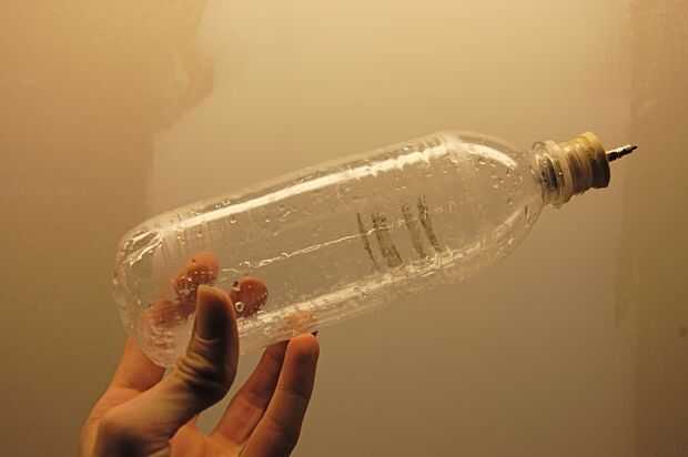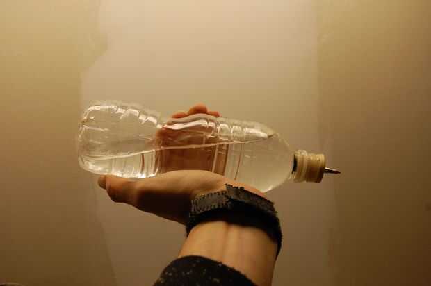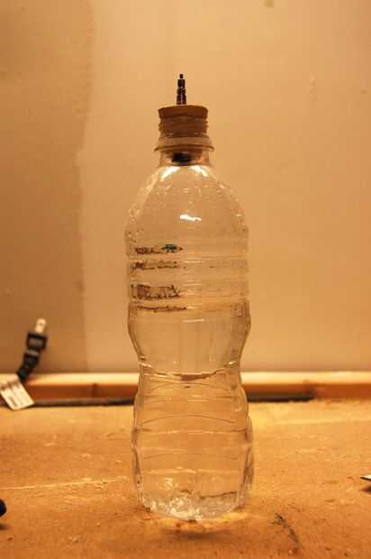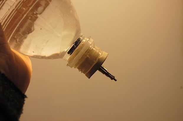 Agarra una botella de agua y llenar hasta un tercio a mitad lleno de agua *. Llene el tapón en el extremo como sea posible. El obturador debe permanecer en el lugar incluso si la botella se invierte. Tenga en cuenta que puede apretar la tuerca pequeña en el extremo de la válvula de Presta para evitar que el agua que sale durante la carga.