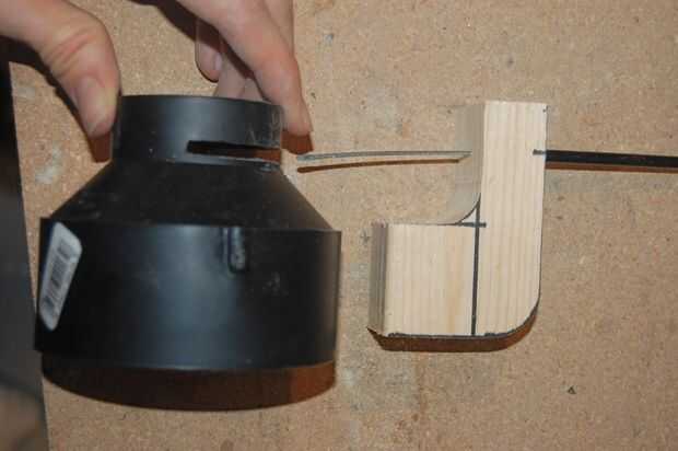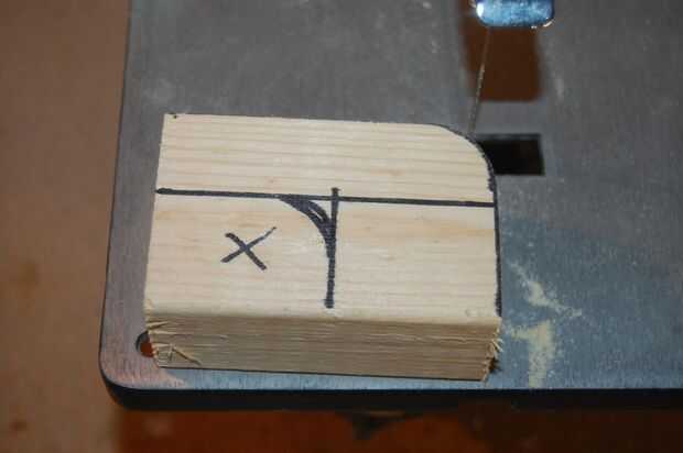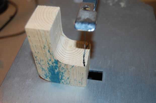 Hay solo lo que queda que hacer. Utilizando el borde del enganche como guía, dibuje un arco en el montaje del lanzamiento donde eventualmente se acoplará con el acoplador. Guíese por esta marca y corte la curva de una sierra (esto es donde una sierra de contornear realmente viene en práctica). Al corte, la Asamblea debe quedar al ras contra la parte grande del acoplador.