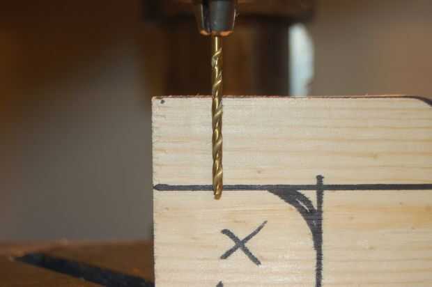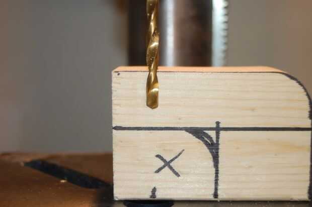 Comience con un poco apenas lo suficientemente grande como para que el cable del freno. Taladro un agujero lo suficientemente lejos que pasa a través de todo el camino a donde la esquina será finalmente cortada. Ahora, seleccione un poco diferente que es apenas lo suficientemente grande como para que la cubierta del cable de freno. Usando el medidor de profundidad, perfore un agujero sobre mitad a 2/3 en la parte superior de la Asamblea, pero no hasta donde se se corte la esquina. Debe dejar un poco de madera hay para el alojamiento del cable descansar contra.