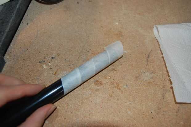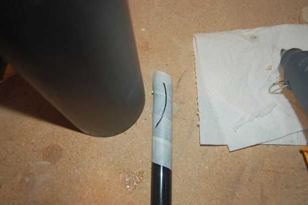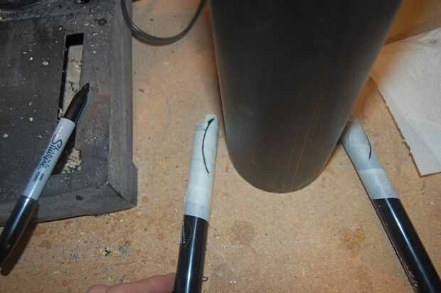 Si el plástico que está usando es negro, como mis mangos, envolver un trozo de cinta adhesiva alrededor del mango, aproximadamente 3" por su longitud. Haciendo referencia a la tubería de 3" ABS, dibuje un arco en el extremo de cada manija. El arco debe ser relativamente larga, por lo que hay una gran cantidad de área de contacto entre el cañón de la bazooka y los tiradores para pegar.