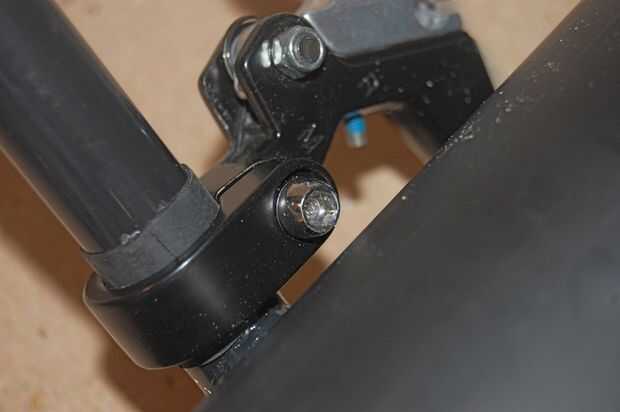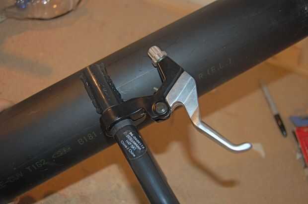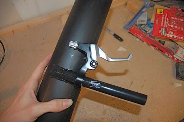 El último paso es colocar la palanca de freno. En mi caso, tuve que añadir una cuña para la palanca de la abrazadera hacia abajo firmemente. Un pedazo de tubo de neumático de la bicicleta (el mismo) que robó la válvula presta) encajan perfectamente. Coloque la palanca del freno en la empuñadura izquierda o derecha y asegúrelo apretando el tornillo.