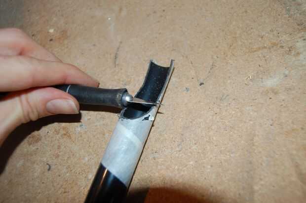 Con una sierra, cortar cuidadosamente a lo largo de la línea, teniendo cuidado de no girar la manija. Limpiar el corte con un cuchillo x-acto o una lijadora (dependiendo de lo que la manija se hace de). Seco-quepa a menudo, para asegurar un ajuste apretado un poco contra el borde del tubo.